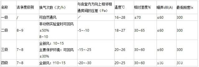 1)、 表中“/”表示不做要求,本表中的噪聲不包括生物安全柜、動物隔離器的噪聲,如包括上述設備的噪聲,則最大不應超過68dB(A)